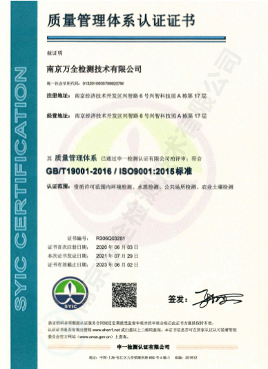 南京萬全檢測技術有限公司,籌建于2013年1月,注冊資金500萬,公司坐落于南京經濟技術開發區興智路6號興智科技園A棟17層,實驗室占地面積1750余平米。公司是一家獲得省級CMA計量認證資質、具有獨立法人、政府認可的綜合性、專業性的檢測機構。環境監測業務是其重要的檢測業務之一,目前已獲得省級計量資格認可項目314項,設備齊全,具有較強的技術能力。